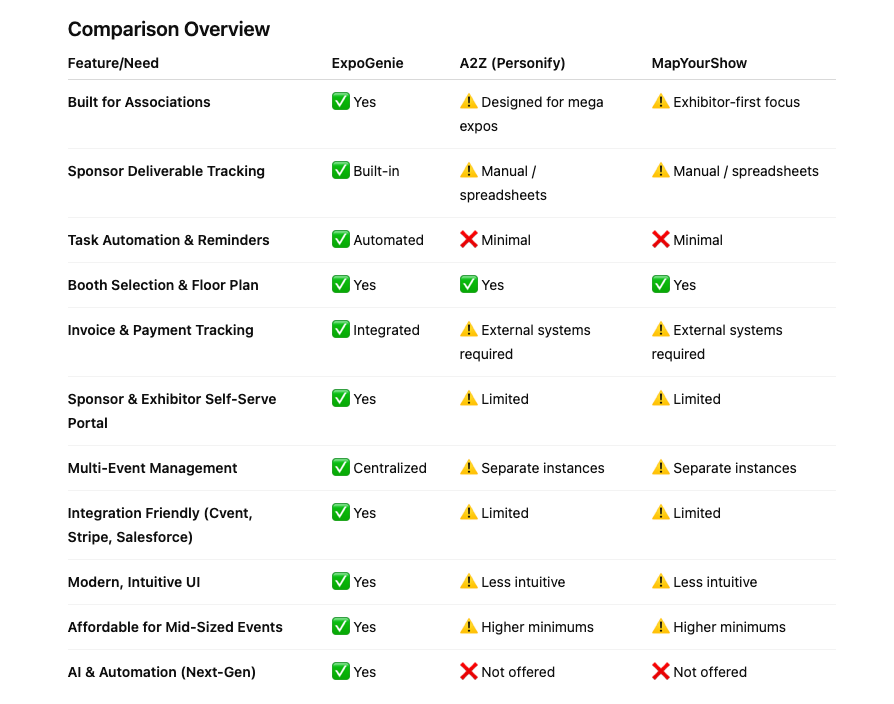 Managing sponsors and exhibitors is critical for the success of your events. Legacy platforms like A2Z and MapYourShow were built for massive expos—not the unique needs of associations focused on sponsor fulfillment, non-dues revenue growth, and member experience.