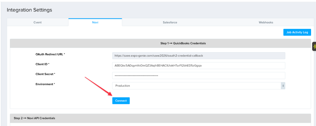 - Instruct client who has QBO access to login to ExpoGenie and click “Connect” on the Novi integrations page