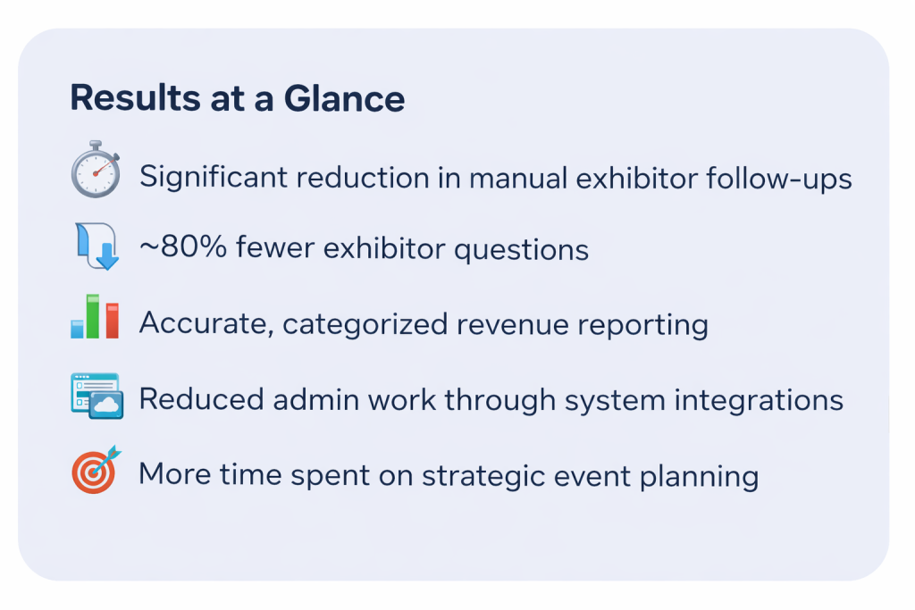 Exhibitors now manage their own booth reservations, payments, and required tasks through a single portal, dramatically reducing operational overhead.